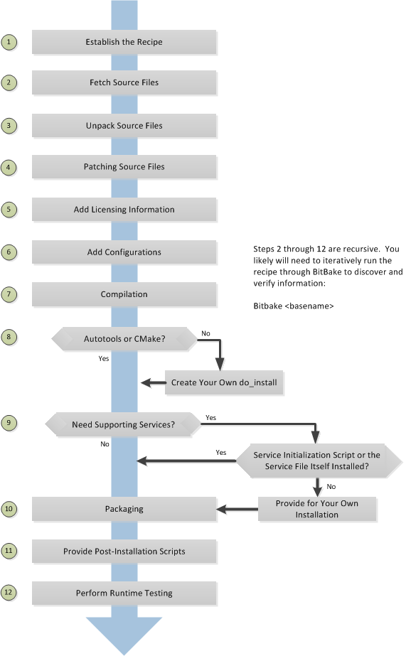 Creating a new recipe is usually an iterative process that requires using BitBake to process the recipe multiple times in order to progressively discover and add information to the recipe file.