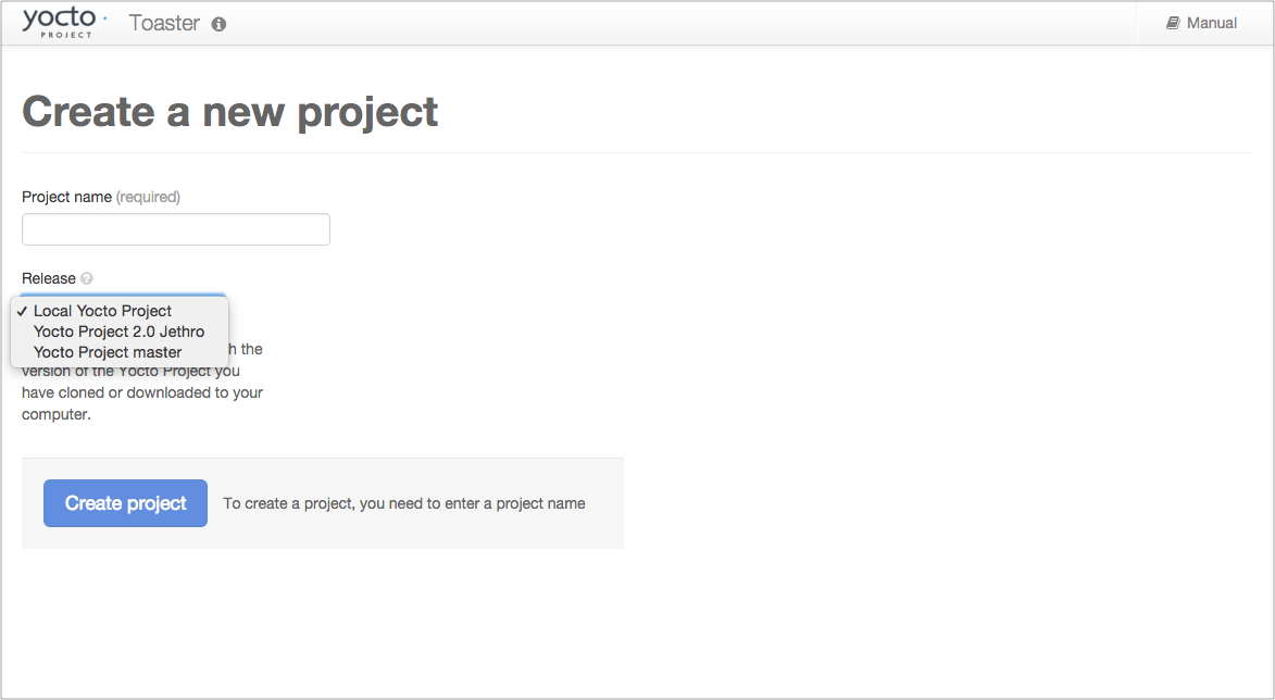 When you create a project in Toaster, you will be asked to provide a name and to select a Yocto Project release. One of the release options you will find is called “Local Yocto Project”.